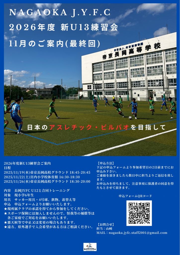 この度、2026年度に向けた新U13練習会のご案内をいたします。